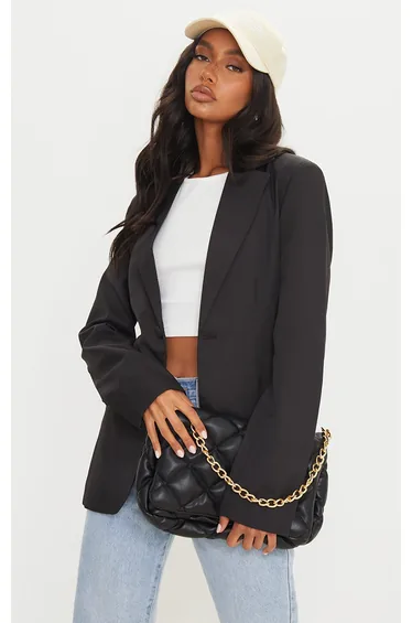 This blazer is our styling saviour for the upcoming season doll. Featuring a black woven material with a cinched design and curved hem detailing, what's not to love? Team over your outfit of the day to elevate the look.