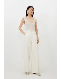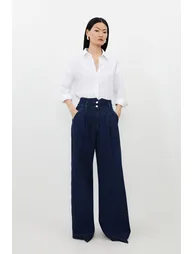 These Karen Millen wide leg trousers manifest effortless sophistication with their dramatic silhouette and clean lines. The high-rise waistband creates a flattering profile that elongates the legs, whilst the structured pleats add dimension and movement. For casual outings, pair with a simple t-shirt and trainers for an understated weekend look. When evening calls, swap flats for heeled mules and add statement jewellery to transform these versatile trousers into an elegant ensemble. The generous length creates a floor-skimming effect that works with both flat and heeled footwear, making these trousers a true wardrobe cornerstone for multiple occasions. Dramatic wide leg silhouette High-rise waistband with double button fastening Front pleats Practical side pockets Versatile denim fabric