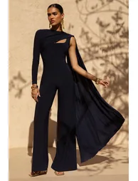 Own the night in Graces, a powerful vision of elegance and edge. Crafted from our signature premium stretch jersey in a rich white hue, this tailored jumpsuit sculpts and smooths every curve. Featuring a sleek high neckline and a dramatic one-sleeve silhouette, Graces is elevated with a cascading cape detail that commands attention with every step. Sophisticated, striking and effortlessly chic. Features - Premium stretch jersey - High neckline - One-long sleeve - Cape detail - Invisible zip closure Sizing & Fit Model is 5’7 and wears UK size 8 / US size 4 Product Information Designed exclusively by Club L London Double layered / good stretch Premium jersey in White (95% Polyester, 5% Elastane) Total inner leg length: 80cmThis style sits on the floor with low heel