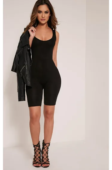 Lashanti Black Unitard This simple all-in-one is sure to give your wardrobe a chic update. Featuring a black jersey material with a scoop neckline and figure-hugging fit, team it with some chunky kicks for a chilled off-duty combo.