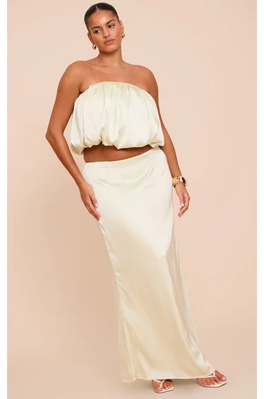 The plus mint green satin puffball bandeau top adds romantic volume with its puffball style and strapless silhouette in satin finish. Team it with high-waisted the matching skirt and nude heels for an elevated summer outfit.