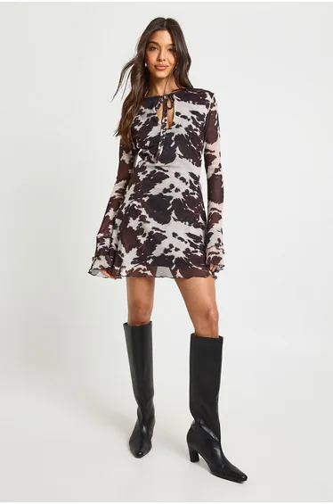 Cow Print Mesh Flare Sleeve Keyhole Mini Dress - chocolate