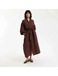 Chic and casual, this maxi dress features a crew neck, long sleeves and gathered dropped shoulders. A flared dress in cotton muslin, belted at the waist. Ideal in the city or on holiday, open over a swimming costume.