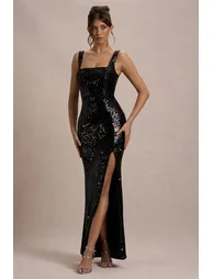 Features- Premium plisse sequin - Square neckline- Invisible zip closure- High leg split - Maxi length