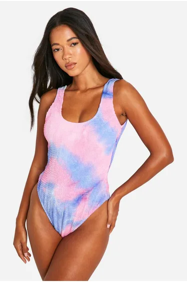 Dip your toe into our collection of women's swimsuits this season. Soak up the sun in a floral bardot one-piece, or keep it cute in an embroidered low back swimsuit. Pair with a floaty kaftan and slides for a super chilled poolside look, or throw on some frayed-hem shorts and grab your beach bag for a walk along the beach. From nautical designs to sexy plunge swimsuits, we have some of the hottest styles of the summer. Whatever your vibe, we’ve got a women's swimsuit for you. Shop everything from trending leopard print swimsuits through to classic black options here on boohoo.Style: SwimsuitDesign: Tie DyeFabric: SwimNeckline: Scoop