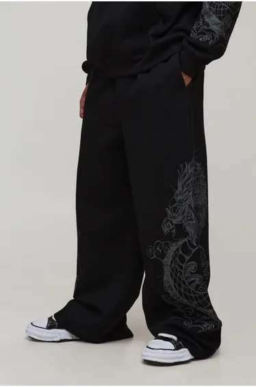 بنطلون رياضي بأرجل عريضة بطبعة غرافيك - أسود