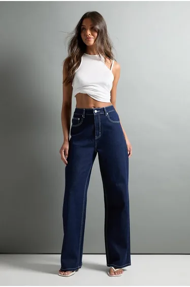 بنطلون جينز بأرجل مستقيمة بخصر عالي - كحلي