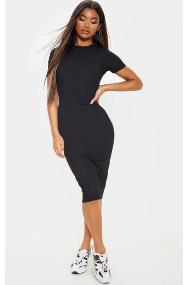 فستان أسود متوسط الطول برقبة دائرية ومضلع. هذا فستان LBD البسيط مثالي للارتداء لأعلى أو لأسفل. يتميز بمادة مضلعة سوداء مع خط رقبة دائرية وطول متوسط ، قم بتجميعه مع بعض الركلات المكتنزة للحصول على مزيج بارد ولكن أنيق خارج أوقات العمل.