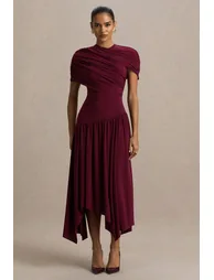 Features- Premium stretch jersey- High neckline- Cape sleeves- Gathered detailing- Asymmetric waistline- Hanky hemline- Midi length