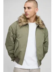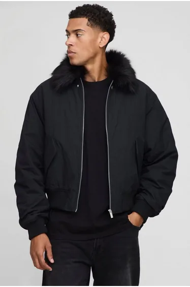 Regular Fit Faux Fur Collar Nylon Bomber Jacket - black