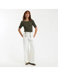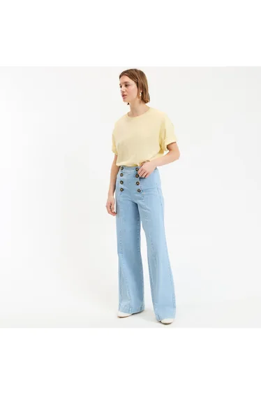 These nautical style sailor trousers are styled here in denim. Cut wide at the leg for an on-trend look. Why not wear yours with a loose fit blouse tucked into the waistband and loafers for a city slick look.