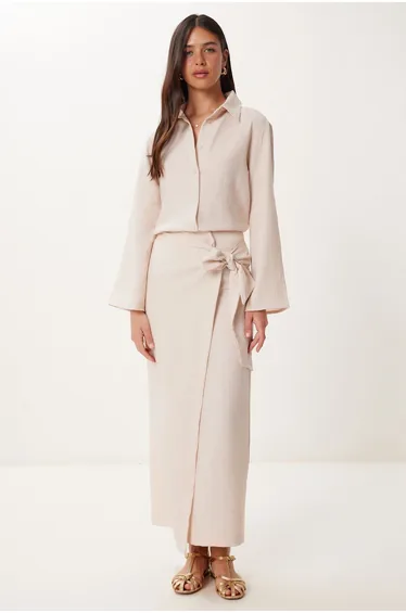 50% Cotton 50% Polyester;Set consisting of a button-down shirt and a hidden zipper, tie detail, asymmetrical cut skirt;Shirt Length: 63 cm Skirt Length: 96 cm;Colors May Vary Due to Light Differences in Studio Shoots.;Height: 1.75 cm. Chest: 81 cm. Waist: 61 cm. Hip: 89 cm.