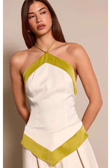 Elevate your evening look with this cream satin contrast halterneck top. Designed in smooth satin with contrast detailing and a halterneck neckline for a sleek, flattering fit. Style with tailored trousers or a maxi skirt for a polished finish.