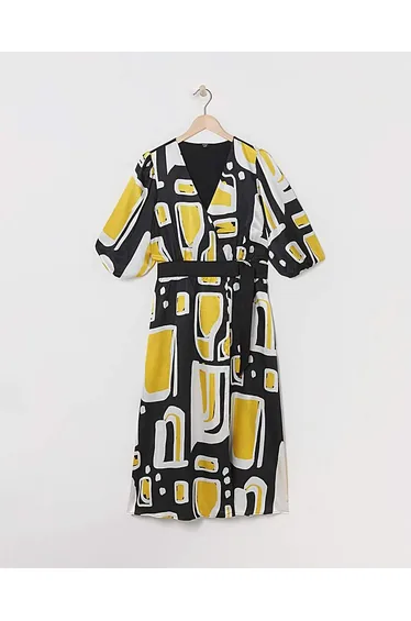 This stunning Joanna Hope dress features a unique abstract print and cut from a textured satin featuring gorgeous puffed sleeves and comes in a wrap shape with a functional tie belt. The perfect spring occasion dress.