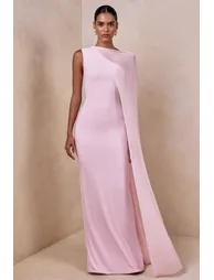 Features- Premium stretch jersey- High neckline- Asymmetric mesh-cape sleeve- Maxi length