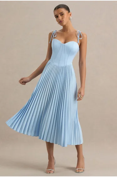Exude timeless elegance and soft femininity, for all dressed-up moments this season, in Peyton. Crafted in a delicate powder blue shade of our premium stretch satin, this midi dress captures a look of classic glamour with a modern twist. Cut with a chic sweetheart neckline and self-tie straps, this midi gorgeously displays your decolletage. The internal bust cups and a boned bodice, paired with the self-tie back detail, create a sleek and snatched silhouette ensuring you are flattered from all angles. Finished with a pleated a-line skirt that elevates this dress by adding effortless movement with every step. From garden parties to wedding receptions, in Peyton, you won't be forgotten.