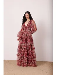 With long sleeves and a deep V neckline, the dress combines elegance with ease. The accentuated waist creates a flattering fit, while the flowing A line skirt moves beautifully with every step.