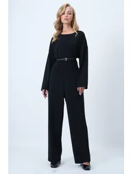70% polyester 30% cotton ; Product length: 150 cm chest: 110 cm waist: 100 cm hip: 120 cm hips: 70 cm inner leg length: 78 cm sleeve: 60 cm leg width: 28 cm; The design offers a comfortable stance with its relaxed fit, and the crew neck form gives it a simple and timeless look. The zipper detail on the back adds a modern touch while providing practical use. Its flowing structure creates a feminine silhouette, while its wide cut provides freedom of movement. The meticulously crafted details make it a unique alternative in women's clothing combinations, complementing both daily elegance and a trendy style. Sample size: s/36/1; model's measurements: height: 1.70, chest: 80, waist: 58, hip: 89, size: s/36/1; colors may vary in studio shots due to lighting differences.