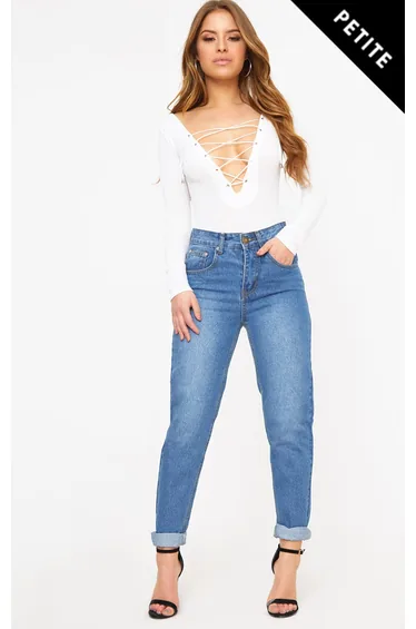 Petite Midwash Mom Jeans Add a staple pair off jeans to your off duty collection with these must have mom jeans. Team with a lace up body and barely there heels for an effortless look that we're crushin' on