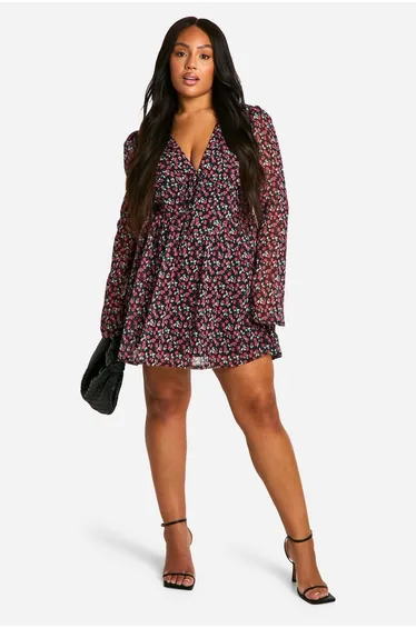 Bring a new kinda attitude in this latest piece from our collection of plus size dresses. Available in UK sizes 16-24, our range of curve dresses carries all the on-trend pieces you need to feel confident. Whether it's a plus size black dress or skater style you're adding to your basket, we promise no more awkward fits, just dresses you can depend on. Work a flattering plus size t-shirt dress or smock shapes during the day, then take on the night in sexy styles, maxi lengths and Bardot necklines. From sexy plus size dresses to work-wear appropriate options, shop it all on boohoo.Style: Skater DressDesign: FloralFabric: ChiffonLength: MiniSleeve Length: Long Sleeve