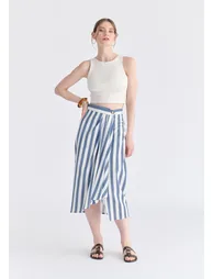 Our draped skirt captures the ease of summer. Made from viscose and linen, its unique draped construction creates a flattering tulip-style front. While the front is punctuated by a singular button, the back is completed with a back elasticated waistband to ensure a seamless, gap-free fit that moves with you.