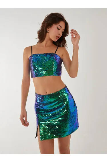 Refresh your party wardrobe with this mini skirt. Featuring sequin detail, mini length and thigh split, team with our Sequin Bralette and heels for an effortless party look.