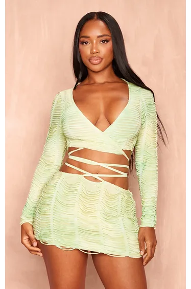 Blessed with a body like an hourglass? Good for you girl. PLT Shape is designed with you in mind, with a few figure and curve enhancing tweaks to give you the perfect fit. Take your weekend look to a whole new level with this shape green shredded seamless tie crop top. Brought to you in a green material with a shredded design, tie detailing, long sleeves and a cropped fit, how can you resist? Style this crop top with the matching skirt, heels and gold accessories for a look that is sure to make you stand out from the crowd.