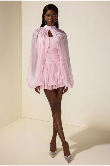 • أكمام طويلة، بدون أكتاف، لون سادة، وردي، مع عباءة، فستان قصير