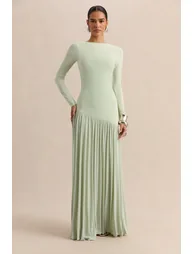 Features- Premium stretch jersey- Crew neckline- Asymmetric drop waist- Long sleeves- Invisible zip closure- Maxi length